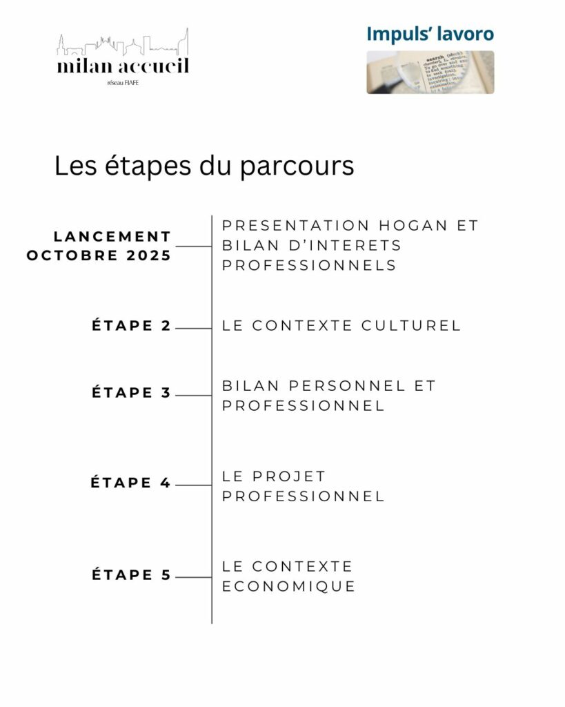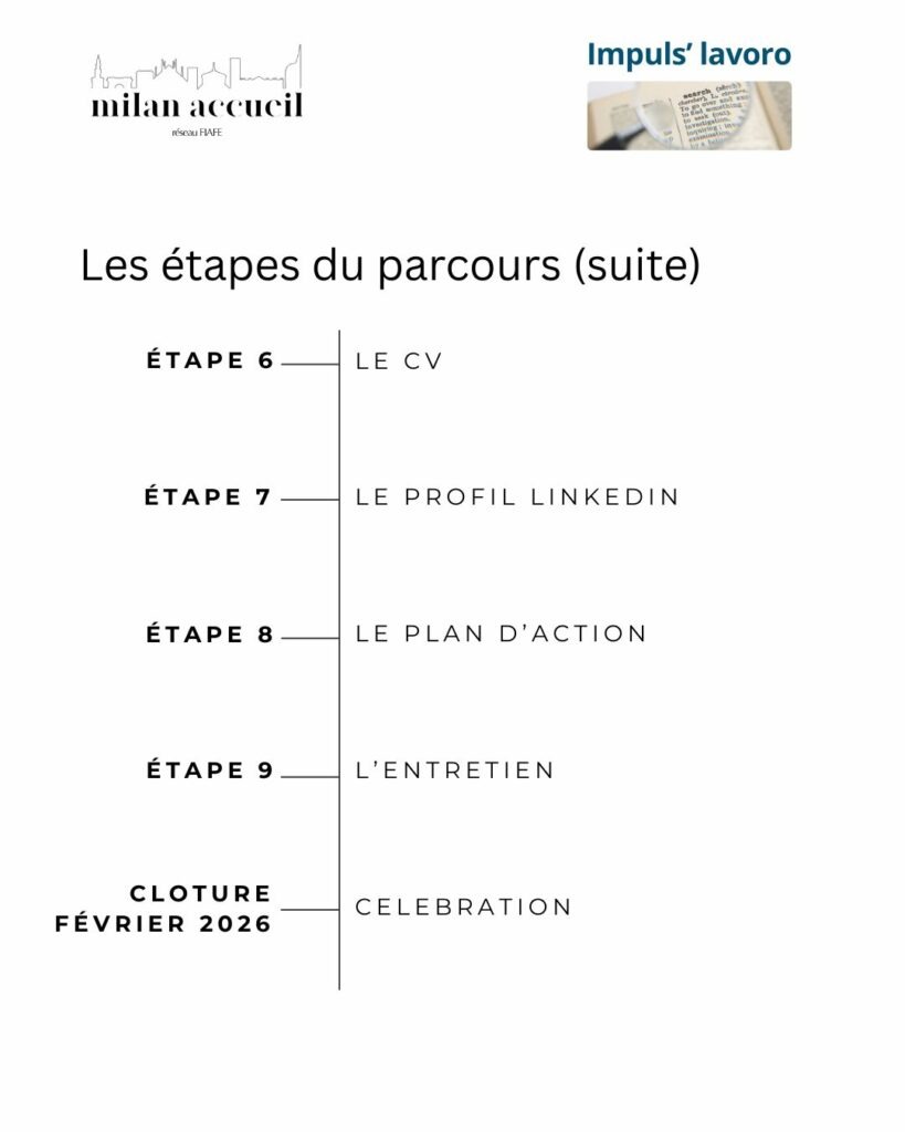 L’inscription à ce rendez-vous, réservée aux adhérents de Milan Accueil, signifie l’inscription à l’ensemble du parcours Impuls’ Lavoro (2ème chance après la réunion de lancement).